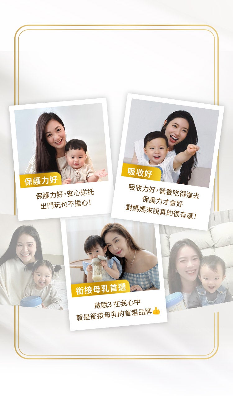 - 根據 2024 年嬰幼兒奶粉市場調查結果,在目前使用 3 階奶粉的受訪者媽媽中,啟賦3 是最多媽媽認同銜接母乳首選,為調查品牌中第一。